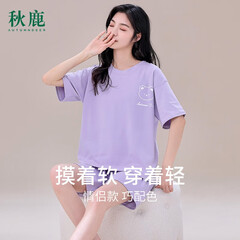 秋鹿情侣睡衣女夏季圆领纯棉印花短袖简约男士休闲家居服套装 浅紫女31 L