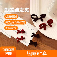 ¥6.01新年红色喜庆丝绒植绒珍珠蝴蝶结发夹边夹 热卖6件套