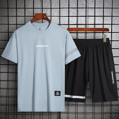 ¥169.00莱恩公鸡休闲短袖套装男夏季新款网眼透气时尚运动T恤短裤两件套 男YXC2013灰色 3XL(约145-160斤)