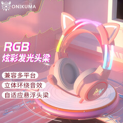 ¥169.00ONIKUMA电脑耳机头戴式有线 电竞游戏耳机带麦克风话筒 男女生主播吃鸡降噪耳麦发光台式笔记本通用耳机 可爱粉猫耳版(RGB发光头梁)