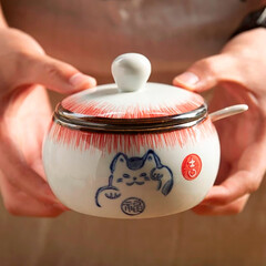 ¥21.80和风四季日式釉下彩带盖调味罐复古招财猫盐罐油罐厨房调料罐调料盒瓶陶瓷罐辣椒罐猪油罐炖盅甜品罐油辣子罐 (招财猫红色)小号调味罐(300ml)(配小白瓷勺