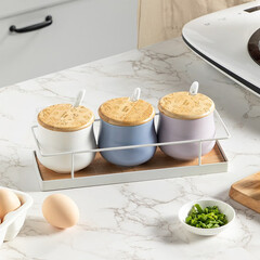 ¥59.90炊大皇(COOKER KING)陶瓷调料罐三组圆形调味瓶调料盒套装3件套盐罐带置物架 【三色调料罐 3个装 带托架】