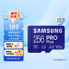 ¥199.00三星(SAMSUNG)256GB TF(MicroSD)存储卡PRO Plus U3 V30读180MB/s写130MB/s高速游戏机平板电脑内存卡