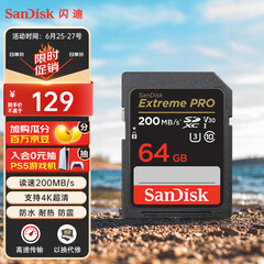 ¥139.00闪迪(SanDisk)64GB SD存储卡 U3 C10 V30 4K 至尊超极速版内存卡 读速200MB/s 写速90MB/s 捕捉4K超高清