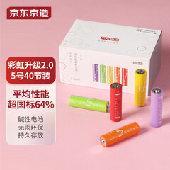 ¥39.99京东京造 碱性彩虹电池 5号40节装 超性能无铅无汞 适用血压计/血糖仪/指纹锁/遥控器/电子称/儿童玩具