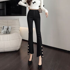 ¥79.00慕伊铭(MUYIMING)排扣喇叭裤长裤2023春夏女装高腰显瘦修身小个子黑色开叉百搭风裤 6682黑色钉扣款_[春秋高弹款] L_110-120斤