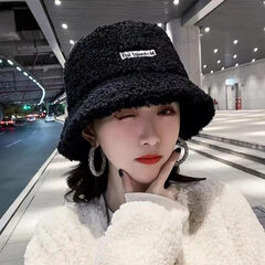 ¥139.90品彩pincai 帽子女ins羊羔毛字母刺绣小檐渔夫秋冬季纯色保暖毛绒帽盆情侣 黑色-h白 均码