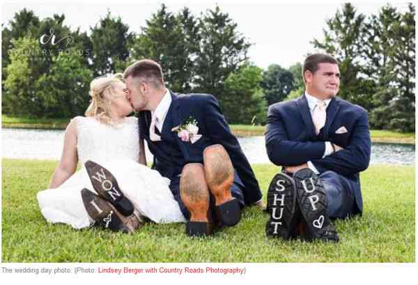 It started out simply enough: When Brittney and Kody Frysinger got engaged, they asked photographer Lindsey Berger if she could re-create a photo Brittney had seen on Pinterest. The couple posed with Kody’s best friend, Mitch Jolliff, and made a clever visual pun of his third-wheel status. Berger Photoshopped “I” onto Brittney’s boot, “Do” onto Kody’s, and “N’T” onto Mitch’s.