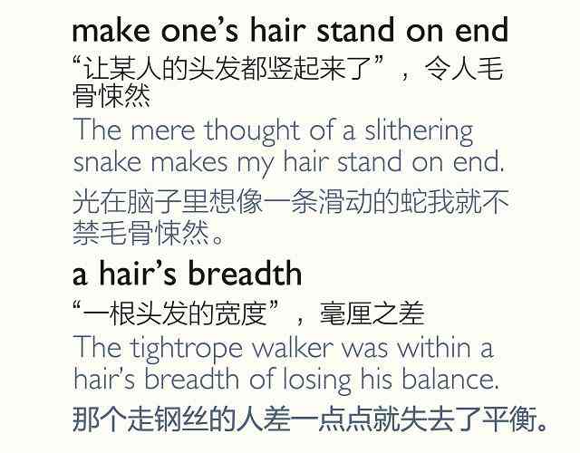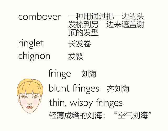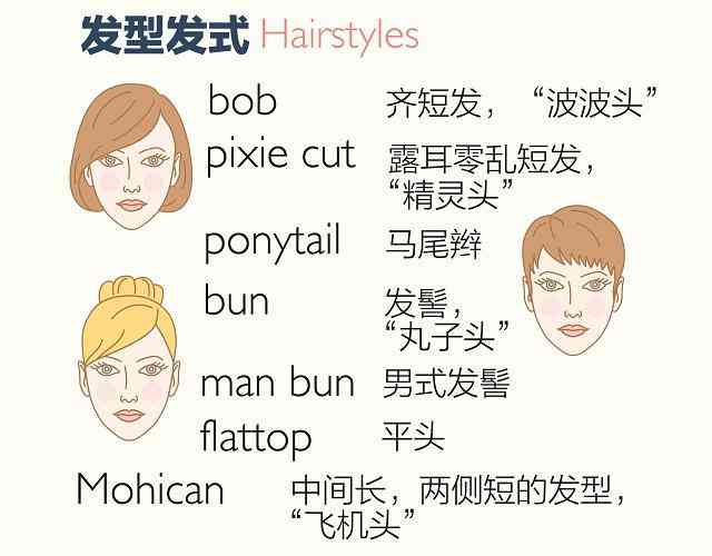 你的标配发型 hairstyle 是什么?是简单可爱的“丸子头”还是灵气十足的“精灵头”?你会用英语形容“空气刘海”吗?英语中又有哪些和“头发”有关的成语?看图,学习英文中一些常见的男式和女式发型名称,以及和“头发”有关的英文表达。