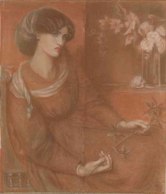 玫瑰花至今仍是常用的示爱之花,对维多利亚时期的人来说它也表示爱情。不同颜色的玫瑰花可以代表爱的深度或纯度,从象征天真的白玫瑰到象征无意识爱恋的紫红玫瑰,不一而足。在罗赛蒂的书房里,花瓶里插的玫瑰是粉红色的。