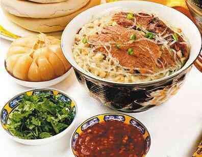 牛肉泡馍译为Pita bread soaked in beef soup;要求馍通过“掰、撕、掐、抖”最终形成“黄豆粒大小的碎粒”。同时,在成品上桌时,应同时有伴碟,包括“20克辣椒酱、50克糖蒜、5克香菜等佐食”,