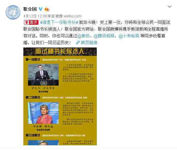 北京时间4月12日晚,联合国官方微博以“就在今晚!史上第一次,你将和全球公民一同面试联合国秘书长候选人!”为题,吸引了众多粉丝的目光。