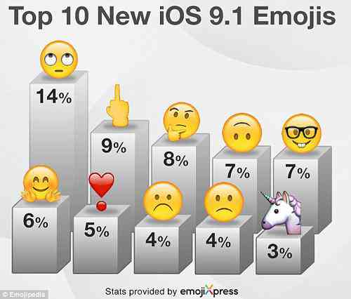 这些结果来自键盘表情应用EmojiXpress所收集的样本,总量达三千万(数据采集日期为2016年1月15日至1月30日)。结果显示,iOS 9.1系统中新表情的使用量仅150万(占5%)。但是就博客发帖而言,新表情在十大常用表情中占了65%。
