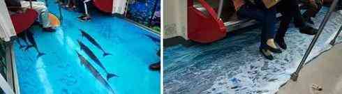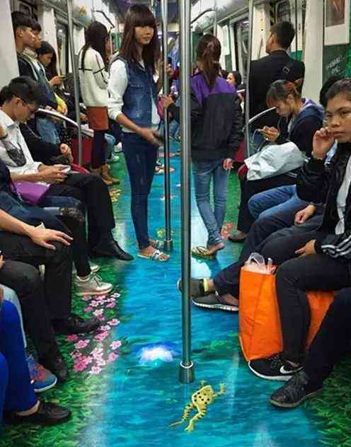 广佛地铁列车涂鸦让人眼前一亮,仿佛走进海底世界,彩色鱼儿、鸭子、青蛙就在你脚下“游弋”、“活蹦乱跳”,海浪阵阵“打湿”脚面。