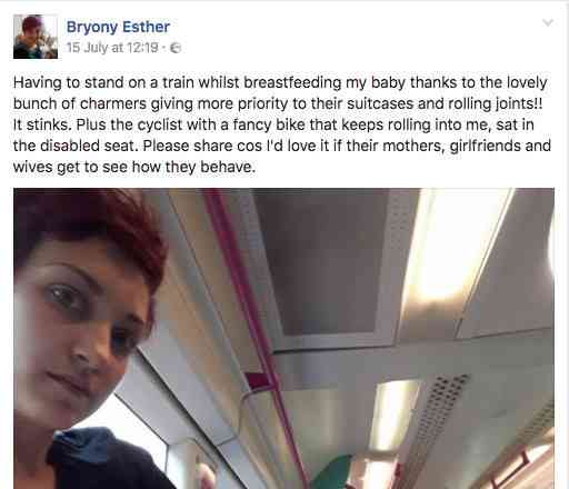 近日,来自英国的布若尼o埃丝特(Bryony Esther)在脸书上发了一张被迫站着哺乳的自拍照,原因是她带着15个月大的宝宝乘坐列车时,附近座位被几位男士占据,由于无人让座,她只能站着进行哺乳。此照片一出,立刻引起关注,对于是否应该让座网友们争执不休。
