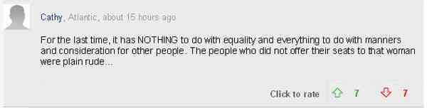 'For the last time, it has NOTHING to do with equality and everything to do with manners and consideration for other people. The people who did not offer their seats to that woman were plain rude... ’