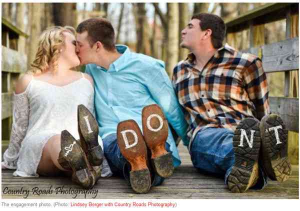 It started out simply enough: When Brittney and Kody Frysinger got engaged, they asked photographer Lindsey Berger if she could re-create a photo Brittney had seen on Pinterest. The couple posed with Kody’s best friend, Mitch Jolliff, and made a clever visual pun of his third-wheel status. Berger Photoshopped “I” onto Brittney’s boot, “Do” onto Kody’s, and “N’T” onto Mitch’s.