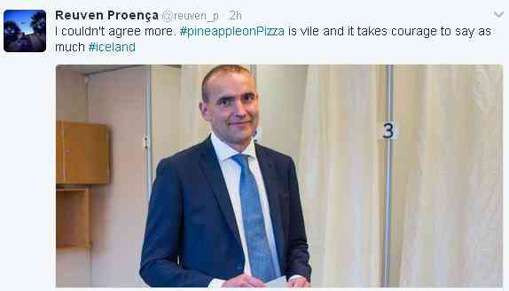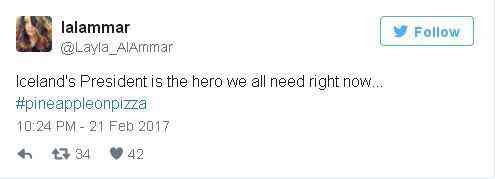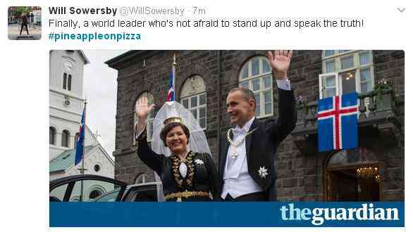 推特用户lalammar表示:“冰岛总统正是我们现在需要的英雄 #披萨上加菠萝”