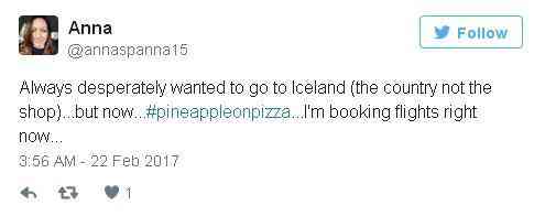 另一位推特用户称:我一直都非常想去冰岛(是国家,不是那家商店),但是现在……#披萨上加菠萝 我马上就订机票……