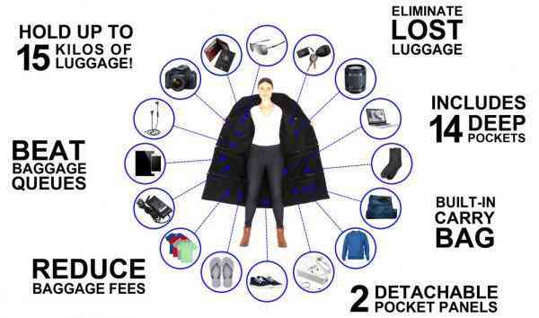 "Wearers need simply slide their luggage into the jacket pockets when checking in and boarding the flight, and once safely off the plane the jacket can easily be unzipped and transformed into a duffle bag capable of holding both the jacket plus all items in the pockets," Juice Promotions Australia, the company behind this unique product, claims.