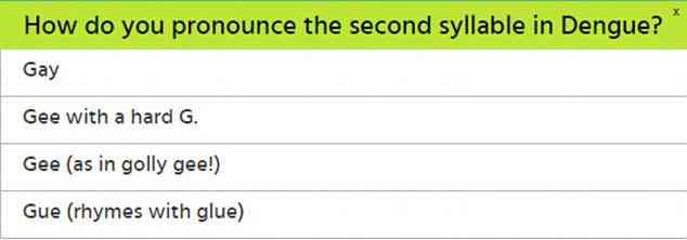 Dengue Fever is a tricky one to say, but the correct pronunciation is den-gee to rhyme, as in 'gee whizz'.