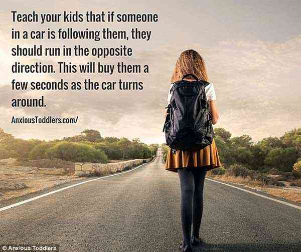 此外,告诉你的孩子如果他们被跟踪或被人追赶,朝着与车子方向相反的方向跑。车子需要转弯,这可以为他们争取一下时间。