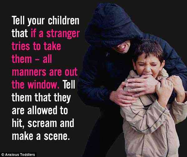 如果一个陌生人试图带走他们,告诉他们这时候所有的礼仪都不需要了,他们可以打别人、尖叫、当众大吵大闹来吸引注意。