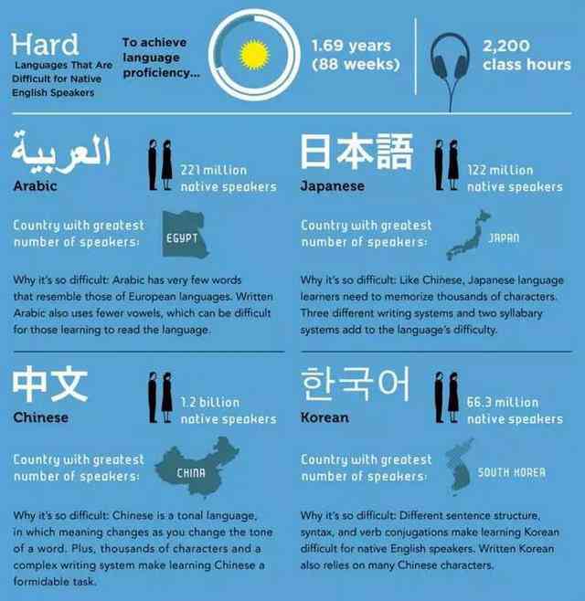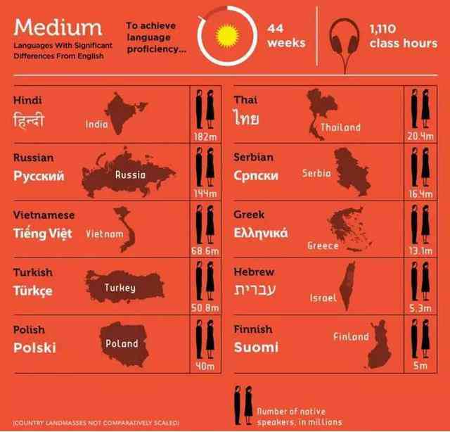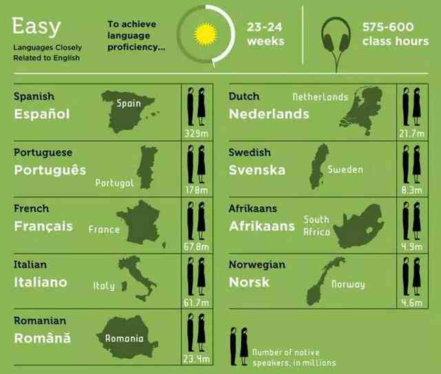 最近,美国国务院外交学院 (The Foreign Service Institute of the U.S. Department of State) 就发布了一份调查,向我们展示了对于英语为母语的人来说,哪些语言是最难学的。让我们从易到难,看看对于说英语的人,其它外语的难易程度究竟如何: